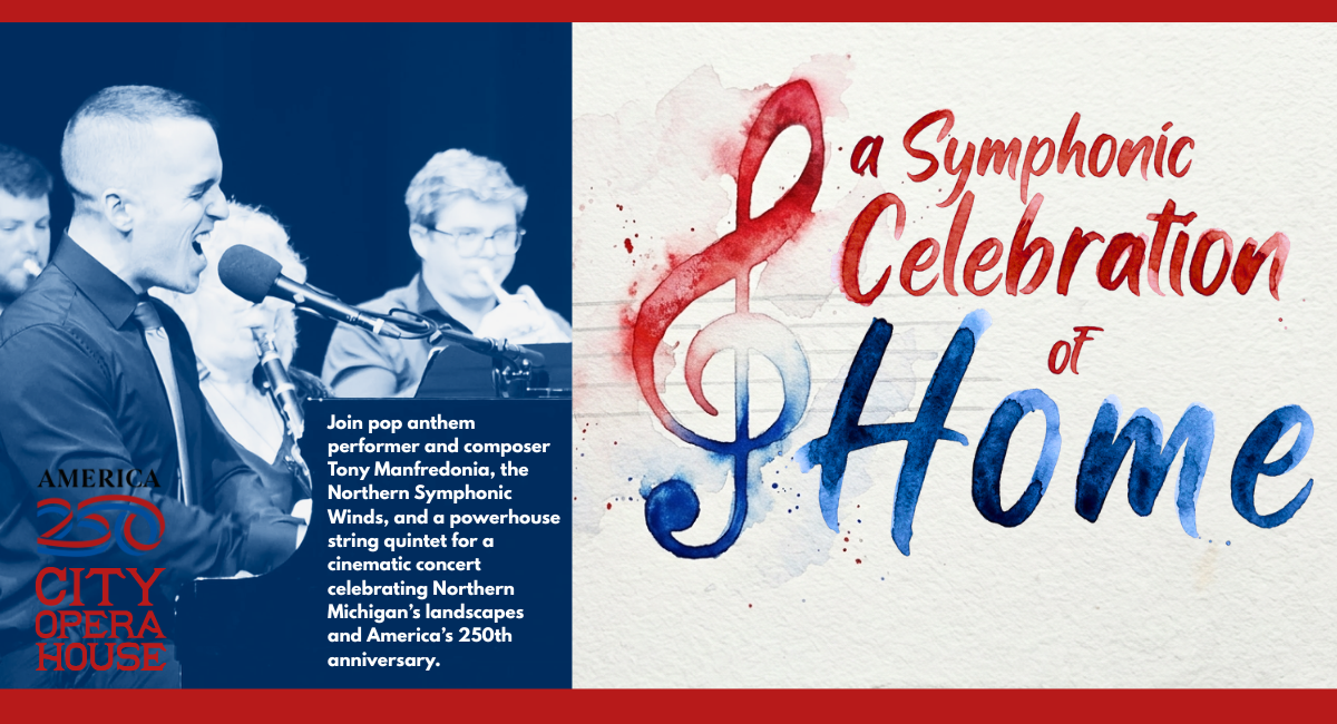 Join pop anthem performer and composer Tony Manfredonia, the Northern Symphonic Winds, and a powerhouse string quintet for a cinematic concert celebrating Northern Michigan’s landscapes and America’s 250th anniversary.